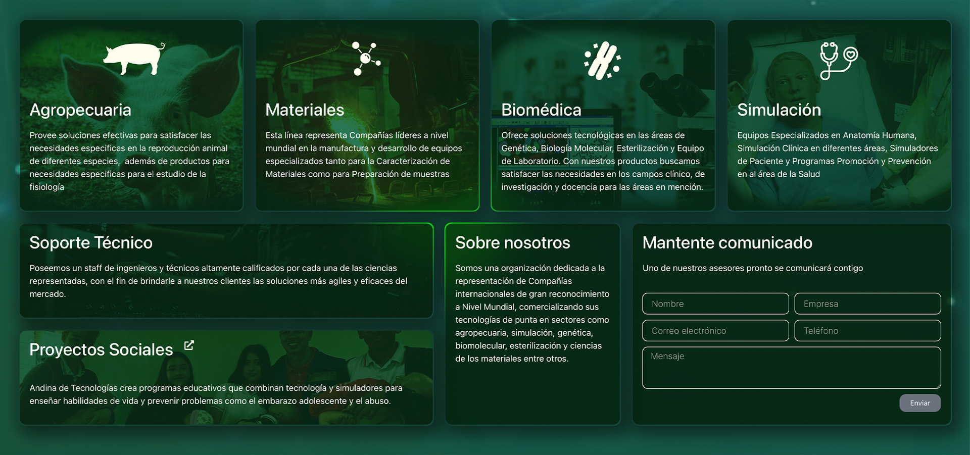 La landing page incluye informaciu00f3n clave sobre la empresa, un resumen de las cuatro unidades de negocio, servicio tu00e9cnico, y acceso a los proyectos sociales de la empresa. Cada secciu00f3n estu00e1 diseu00f1ada para facilitar el acceso a la informaciu00f3n relevante sin abrumar al usuario. Ademu00e1s, se incluye un enlace directo para agendar servicios tu00e9cnicos y un acceso externo al sitio de proyectos sociales, garantizando que toda la informaciu00f3n cru00edtica estu00e9 a un solo clic de distancia.